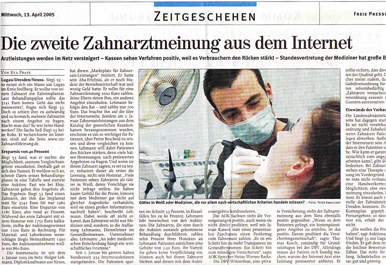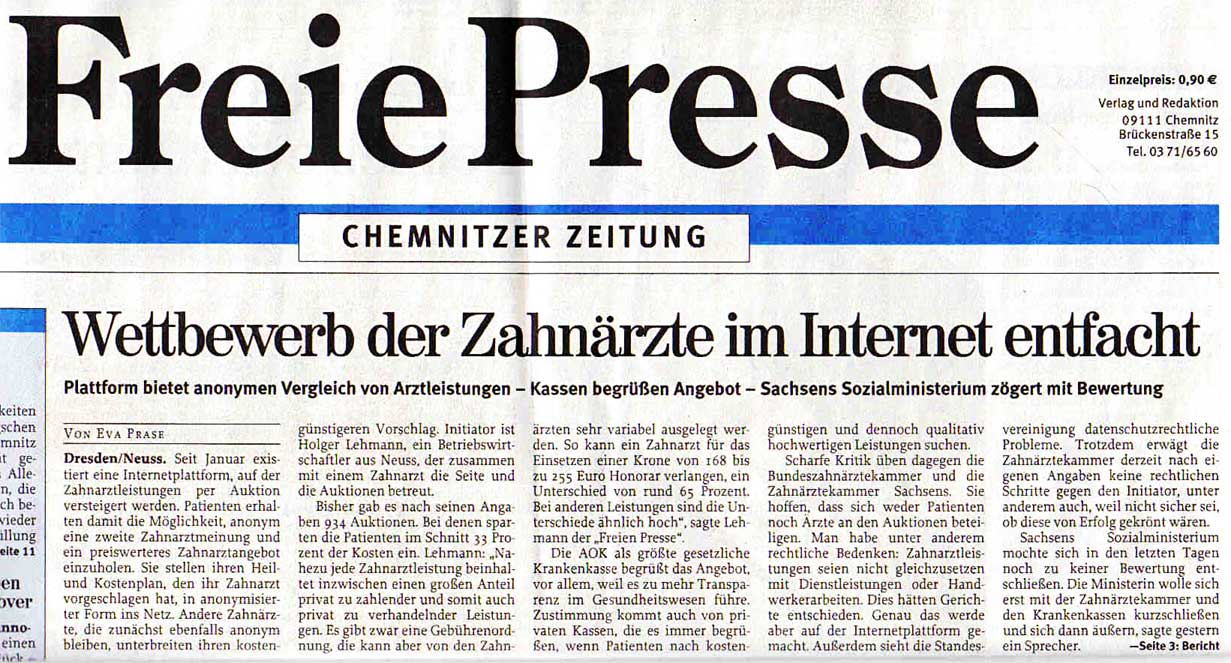 Dresden/Neuss. Seit Januar existiert eine Internetplattform, bei der Zahnarztleistungen per Behandlung versteigert werden. Patienten erhalten damit die Möglichkeit, anonym eine zweite ZahnarztMeinung und ein preiswerteres Zahnarztangebot einzuholen. ...
