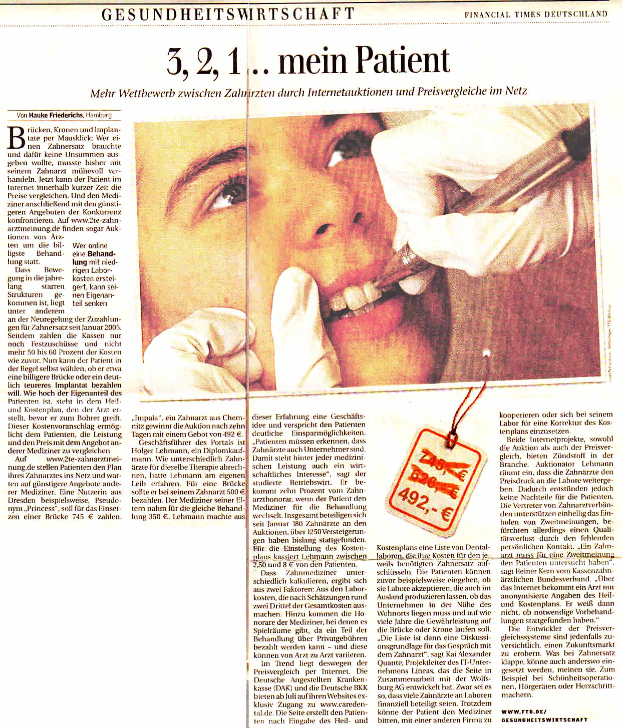 Das Internetportal 2te-zahnarztmeinung.de ist ein Online-Marktplatz für Zahnarztleistungen, dessen Ziel es nach eigener Aussage ist, durch das Zusammenführen von Angebot und Nachfrage die Preise und Leistungen in der Zahnarztbranche transparent und vergleichbar zu machen. ...