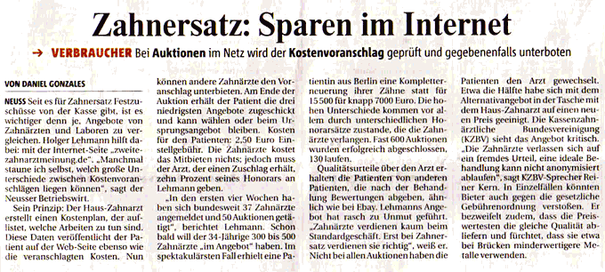 Neuss Seit es für Zahnersatz Festzuschüsse von der Kasse gibt, ist es wichtiger denn je, Angebote von Zahnärzten und Laboren zu vergleichen. Holger Lehmann hilft dabei: mit der Internet-Seite "zweite-zahnarztmeinung.de". "Manchmal staune ich selbst, welch großen Unterschiede zwischen Kostenvoranschlägen liegen können", sagt der Neusser Betriebswirt. ...